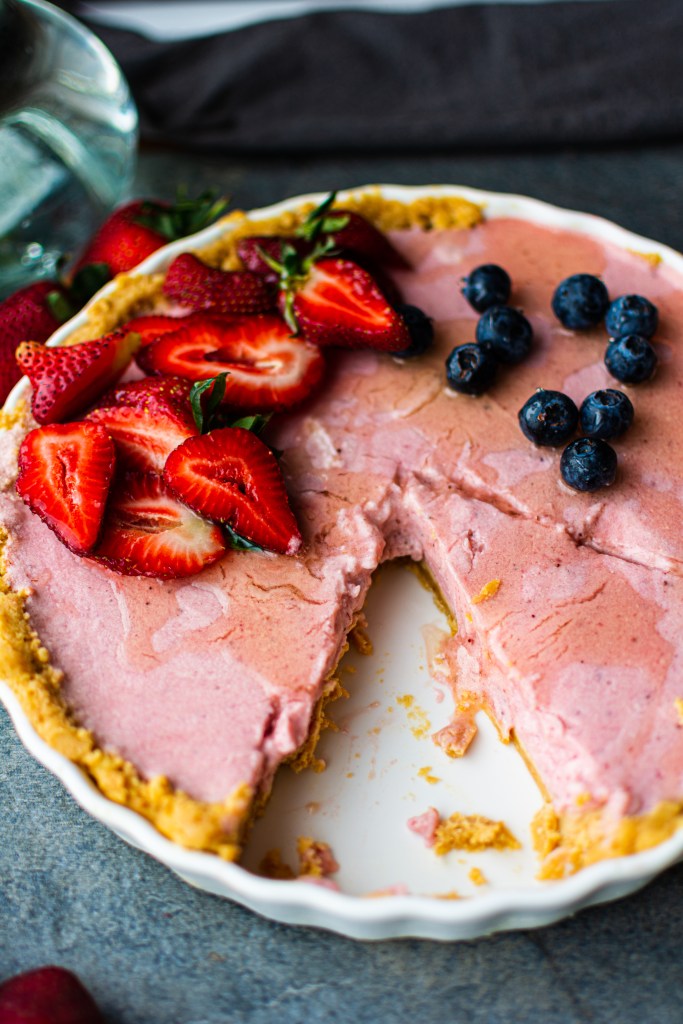 Pour the strawberry mix into the tart base and refrigerate for 2 hours. Enjoy with blueberries and strawberries
