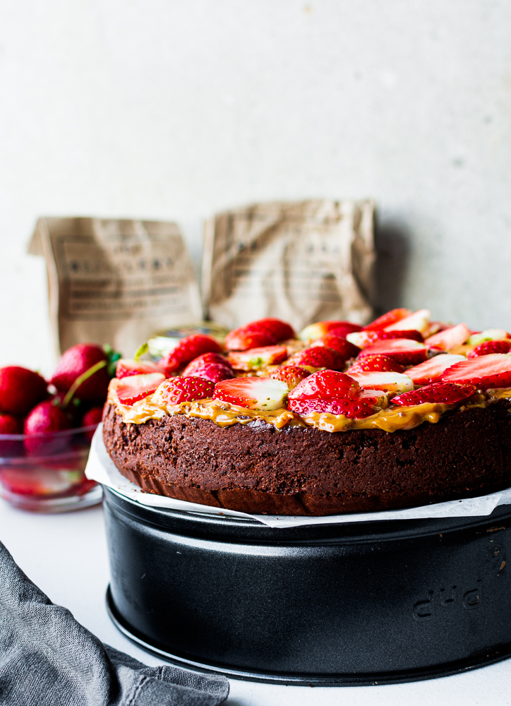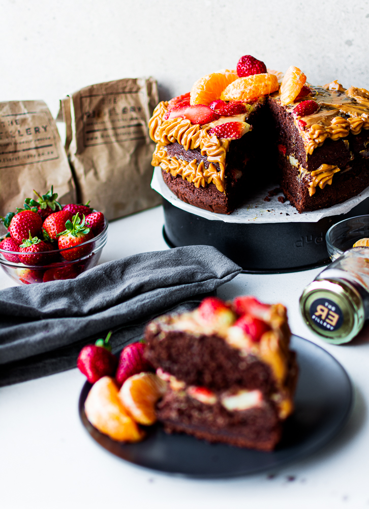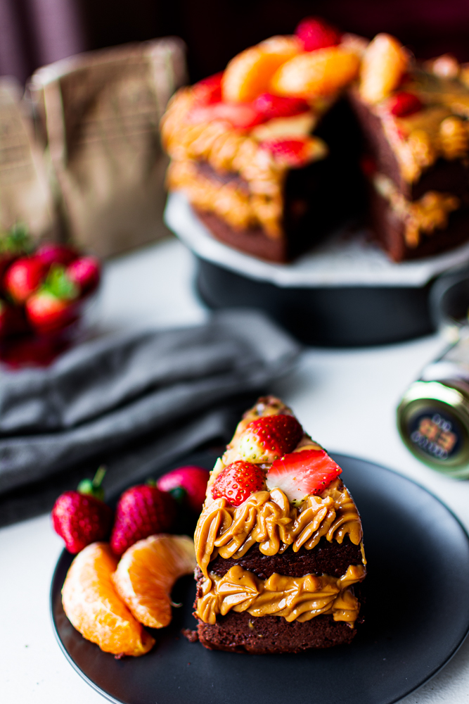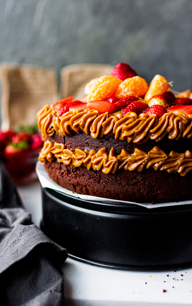 Tender and moist, this almond-cocoa cake is the perfect decadent treat for your next brunch spread! Complete with fresh fruits and a caramel treat swirl, this almond cake is a serious crowd pleaser!