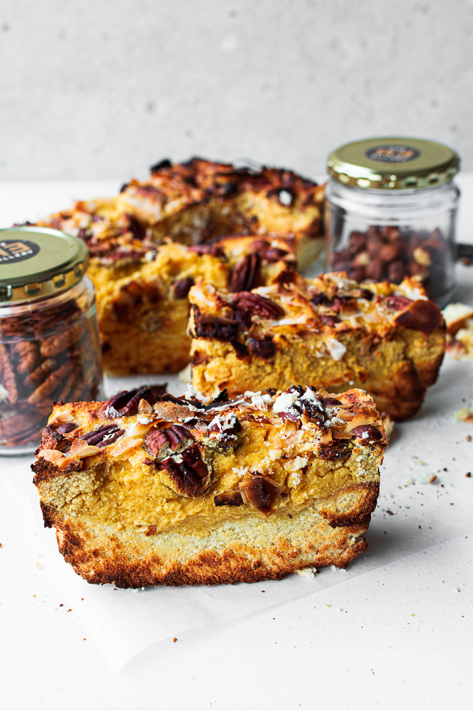 - Place the pecan nuts and hazel nuts on top of the filling then bake for 30 minutes or until coconut is golden brown.