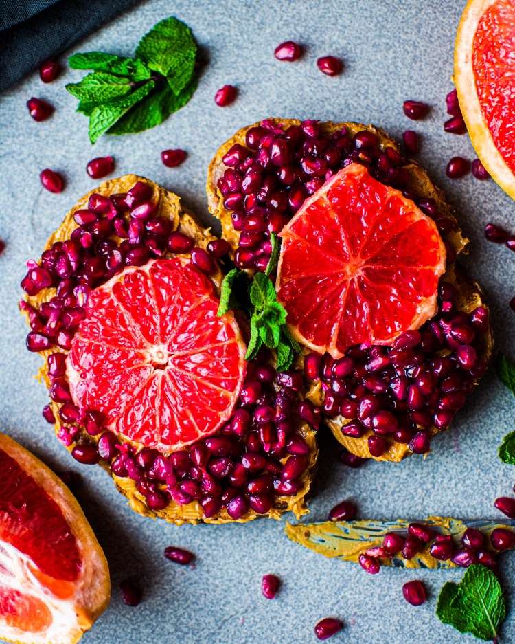 Let’s try to detox and cleanse ourselves by having some peanut butter toast topped with grape fruits and pomegranate.